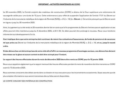On November 28, 2025, the Joint Construction Materials Committee (JCMC) obtained a 10-day safeguard order from the Superior Court. This order suspends the application of section 17.01 of the Decree respecting the metal joinery industry of the Montreal region (CQLR, c. D-2, r. 14) (the “Decree”). This section stipulated that the Decree would remain in force until November 30, 2025.