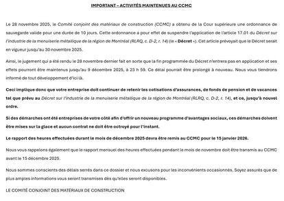 Le 28 novembre 2025, le Comité conjoint des matériaux de construction (CCMC) a obtenu de la Cour supérieure une ordonnance de sauvegarde valide pour une durée de 10 jours. Cette ordonnance a pour effet de suspendre l’application de l’article 17.01 du Décret sur l’industrie de la menuiserie métallique de la région de Montréal (RLRQ, c. D-2, r. 14) (le « Décret »). Cet article prévoyait que le Décret serait en vigueur jusqu’au 30 novembre 2025.